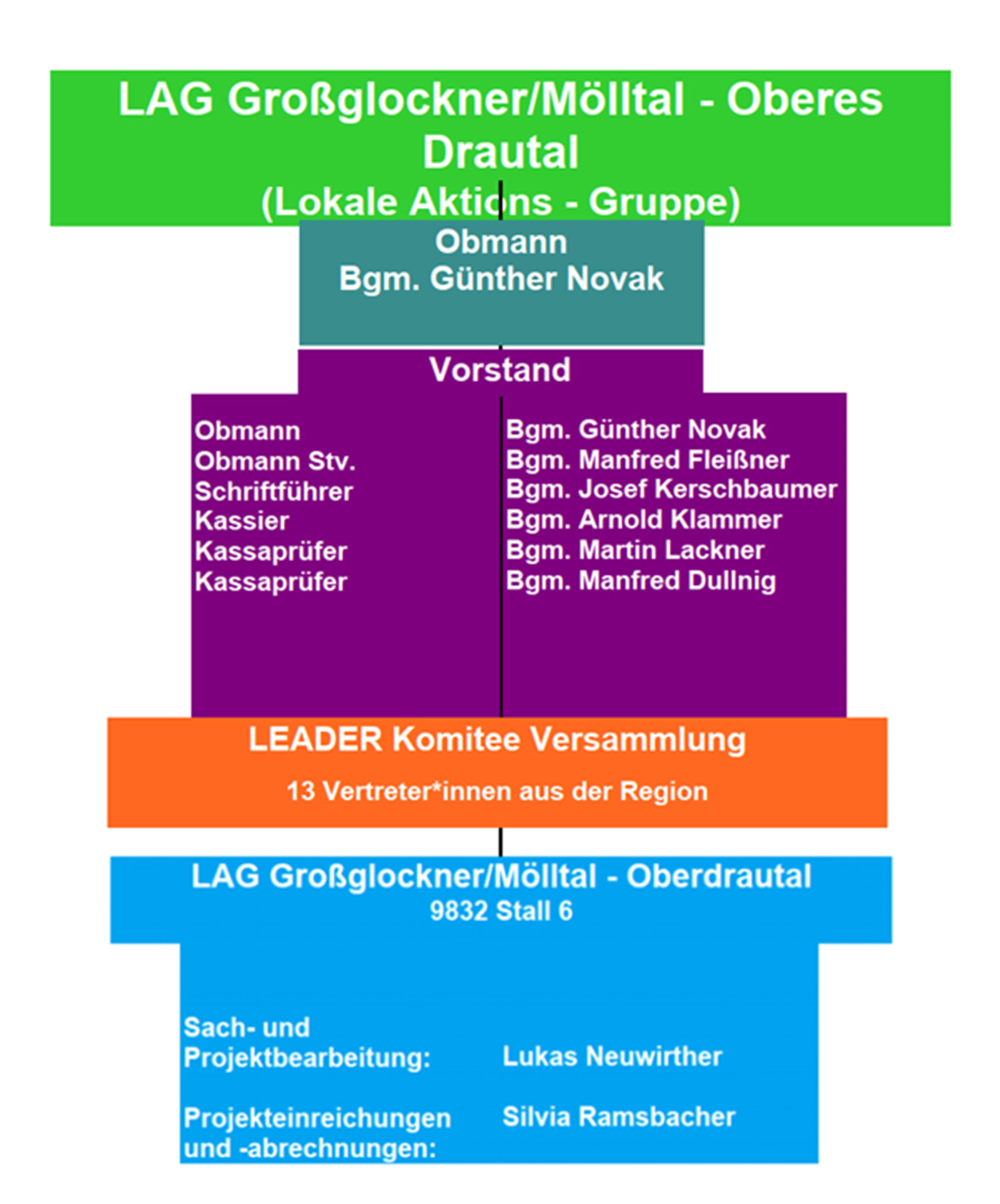 Die Lokale Aktionsgruppe (LAG) Großglockner/Mölltal-Oberdrautal ist als Verein organisiert und im zentralen Melderegister der BH Spittal/Drau eingetragen. ZVR-Zahl: 874042536.